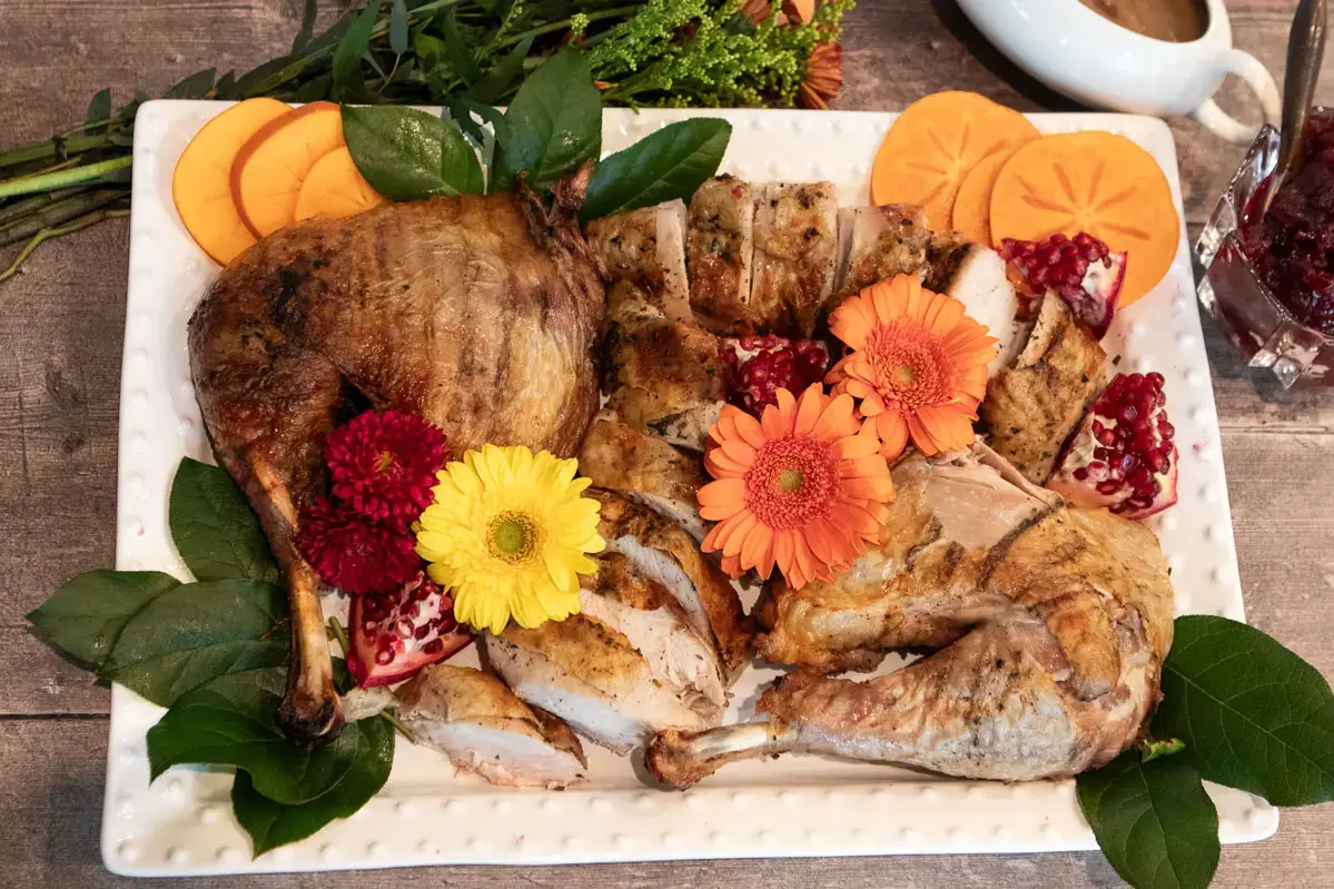 Remove the turkey from the grill and place, breast side up, on a cutting board. Let it rest for 20 minutes and then carve.