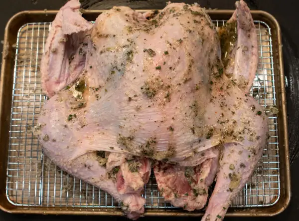 After you or the butcher have spatchcocked the turkey, make a mixture of melted butter and herbs and rub it all over the bird, including under the skin. Refrigerate it uncovered for at least 12 hours or up to 48 hours. Drying it like this will ensure that the skin is crispy when cooked.