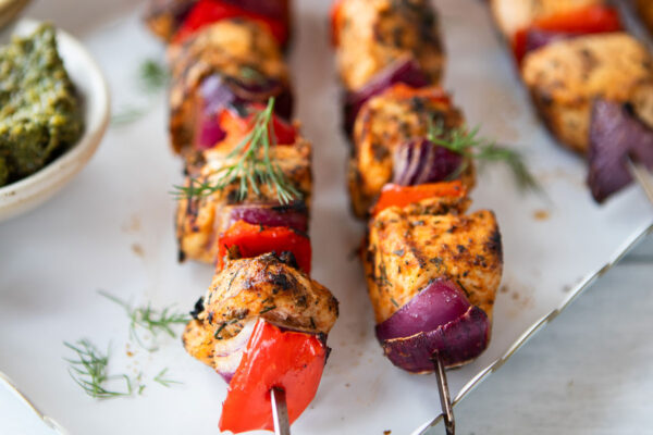 These very flavorful Mediterranean Chicken Skewers are the ideal main course for summer grilling! Marinated chunks of chicken are skewered with red bell peppers and red onions and then grilled. With its lemony and herby marinade, these healthy and delicious skewers are just the ticket for your next spring or summer dinner!